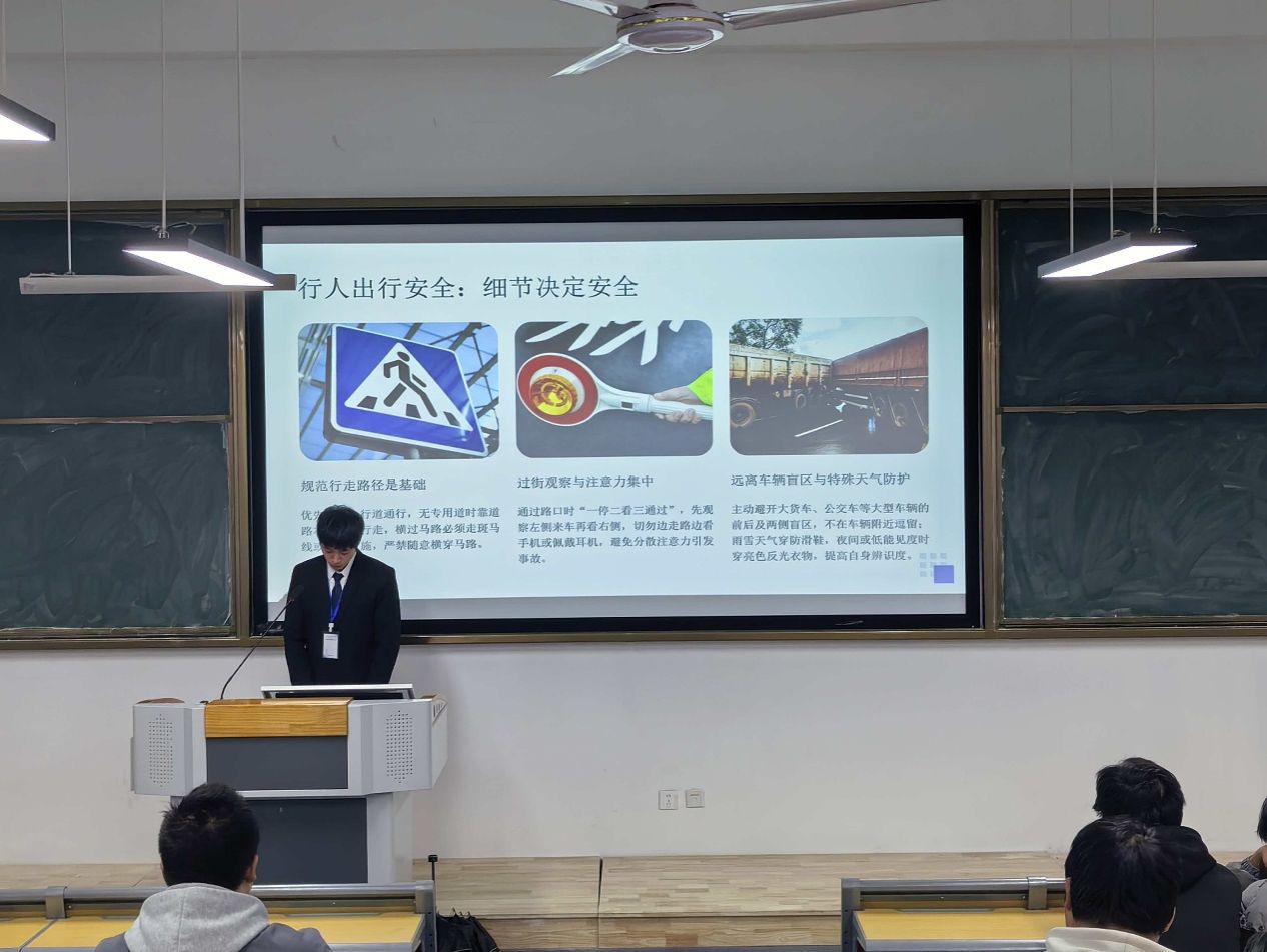 为切实加强学生交通安全教育,提升学生文明出行意识和风险防范能力,筑牢校园安全防线,2025年12月30日17时,航空维修学院自律委员会在抚州校区一号公教楼110教室组织举办了“交通文明,安全同行”主题教育宣讲会。