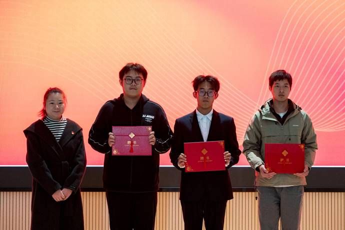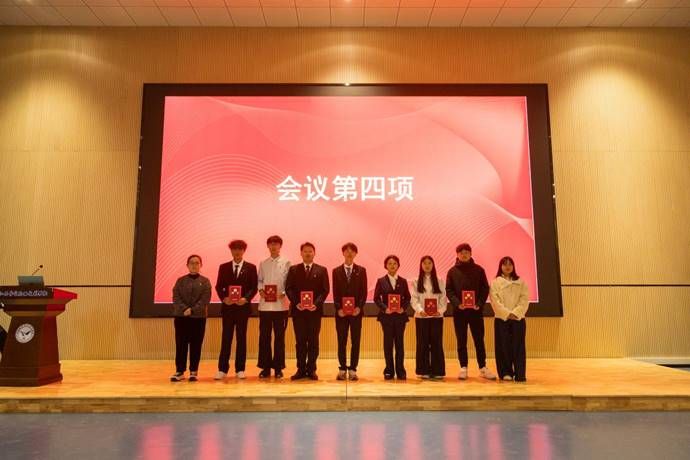 分团委副书记:尹思凯;院学生会主席团:温虹翔、王亦心、黄强波。学院党支部副书记王慧萍老师与分团委书记朱翠林老师为他们颁发了象征责任与信任的聘书。会场内多次响起热烈掌声,既是对候选人们精彩表现的肯定,也是对崭新未来的期待。