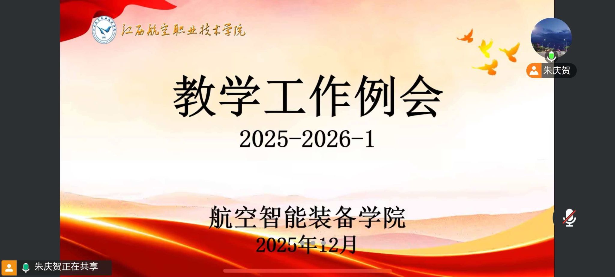 航空智能装备学院于2025年12月23日晚19时30分,通过线上会议平台组织召开了教学工作例会,系统总结本学期教育教学工作,科学规划下一阶段重点任务。会议由学院副院长朱庆贺主持,院长刘勇及全体专任教师共同与会。会议聚焦期末总结、竞赛复盘与未来规划,内容充实,导向明确,为新旧学年工作的顺利衔接与教育教学质量的持续提升奠定了坚实基础。