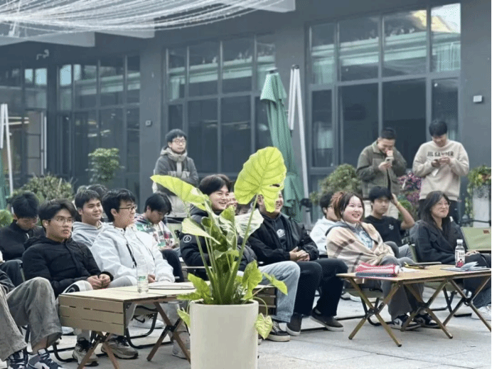 活动现场,折叠椅与绿植交织出轻松的竞技氛围:选手们抱着手机看词、或随着节奏轻晃身体,一首首流行金曲与校园民谣轮番登场,笑意顺着歌声在人群里漾开,那盆宽大的绿植遮不住满场的松弛——有人托着腮听得出神,有人凑在耳边分享刚记住的歌词,连玻璃幕墙都映着这团暖乎乎的热闹,把“同窗”两个字揉进了风里的旋律。