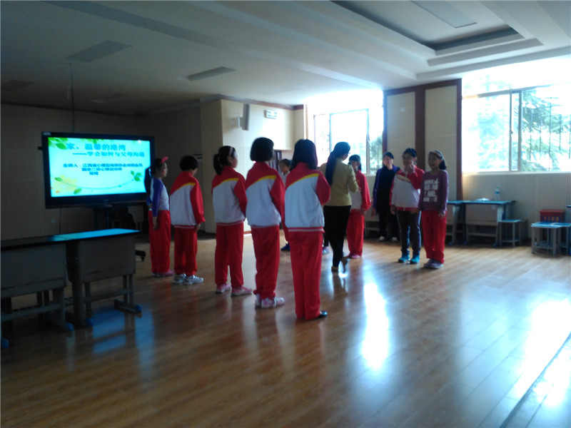 本次讲座的主题是《家,温馨的港湾――学会如何与父母沟通》。针对小学生的特点,吴老师首先设计了一个热身活动“交往纤纤指”,男孩女孩分两批做这个游戏,同学们参与热情很高。活动后同学们分享了自己的感想,让大家了解交往的交互原则,运用到亲子关系中,也是非常恰当的。现场调查在座学生与家长的沟通是否满意,肯定回答者比否定回答者人数明显占优势,说明大部分孩子与家长的沟通还是正向的。通过播放视频“人的一生”,让同学们领悟到时间易逝,亲情宝贵。