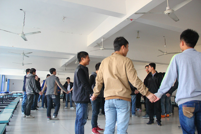 第二单元是“心灵不设防”。为促进成员相互了解,帮助成员客观认识自我,学会信任和接纳,首先十人一组相互自我介绍。然后小组成员离开座位,大家手牵手围成一个大圆,场地上有八九个大圆,同时做“解开千千结”的游戏。成员手拉手,看清楚自己的左手和右手是谁。确认后松手,在圈内自由走动。吴老师叫停,成员定格,位置不动,伸手拉刚刚的右手拉刚刚右边人的左手,左手拉刚刚左边人右手,从而形成很多结或扣。成员不能松手,但可以钻、跨、绕,要求成员设法解决难题,恢复到起始状态。当排除困难、解决问题后,请成员分享活动的感受。
