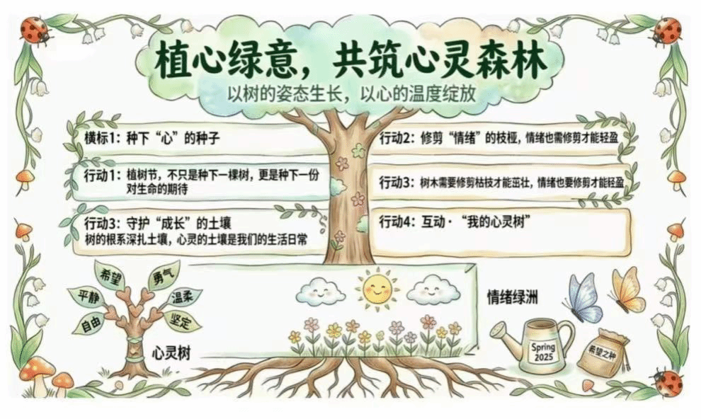 为深入推进大学生心理健康教育工作,践行绿色生态文明理念,在植树节来临之际,2026年3月12日,我校心理社团精心组织开展了以“植绿护绿心向阳,AI绘梦赴春光”为主题的植树节AI手抄报征集活动,全校共有80名同学踊跃投身此次活动。