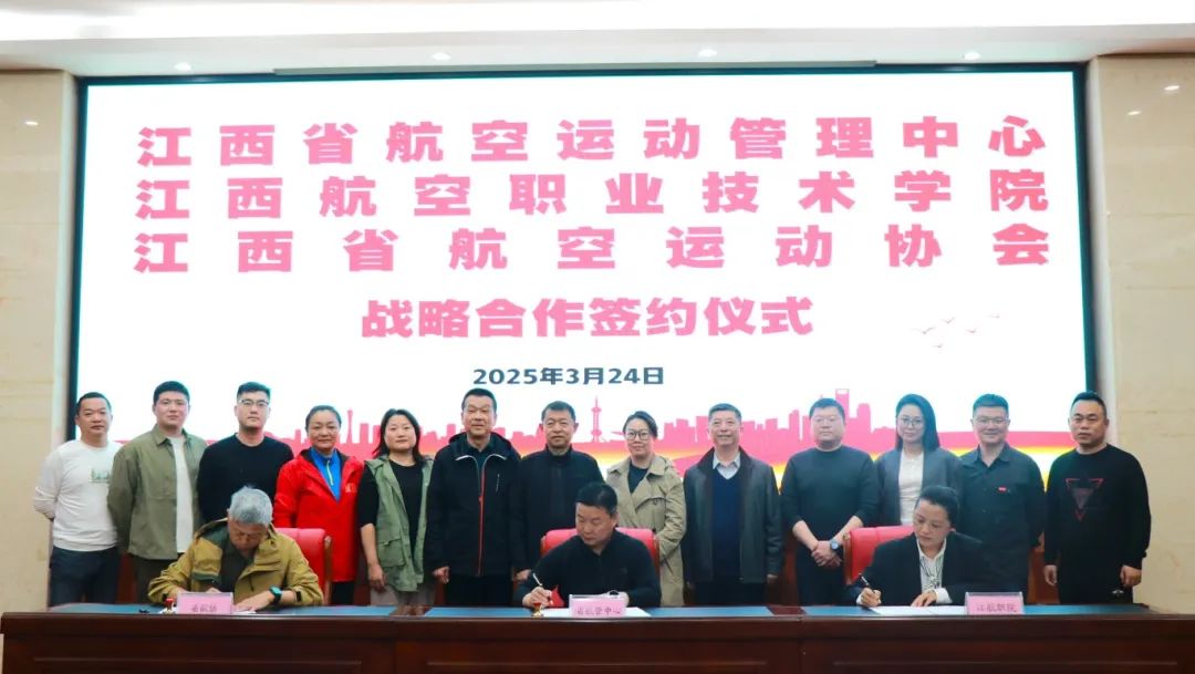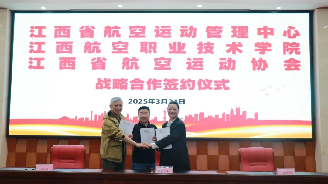 3月24日,江西省航空运动管理中心、江西航空职业技术学院、江西省航空运动协会举行战略合作签约仪式,在江西省航空运动管理中心副主任王勇,江西省航空运动协会秘书长施俊平,校党委书记(督导专员)潘莹璐,党委委员、常务副校长周延,教务长段先志,副校长洪钰,校长助理吴昂等与会领导的见证下,周延、王勇、施俊平分别代表三方共同签署战略合作协议。