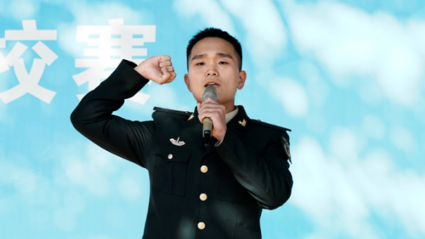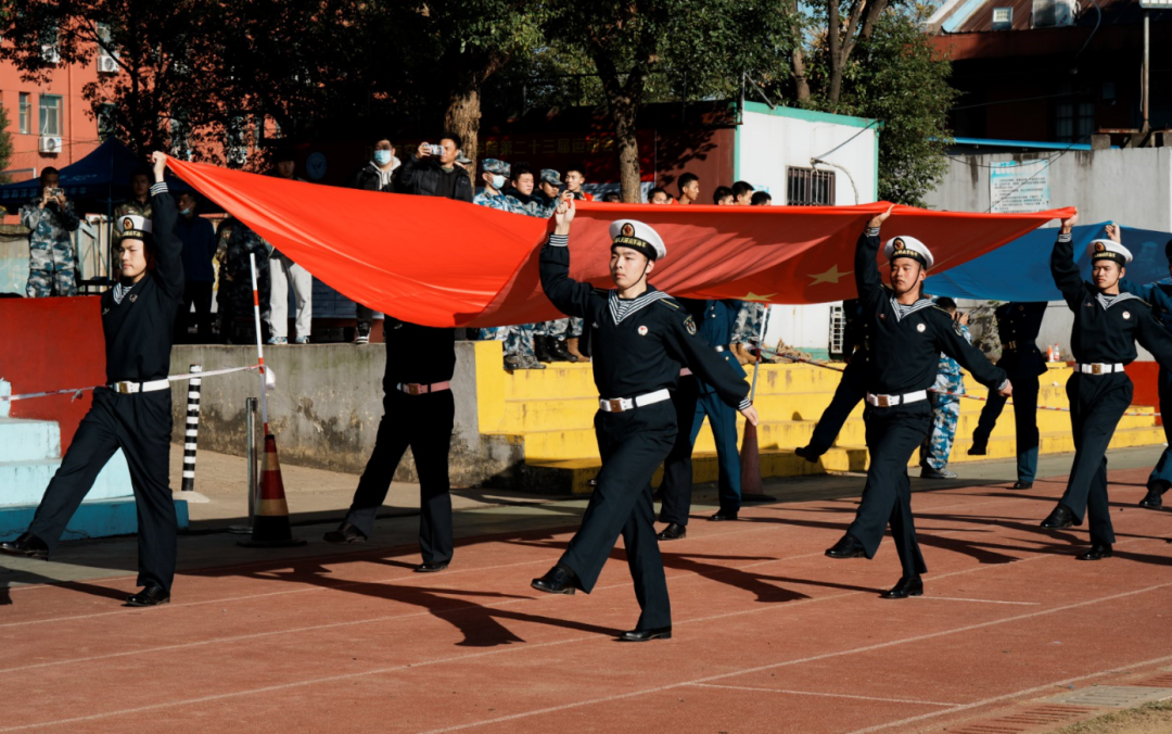 国旗手们精神饱满,目光坚定而锐利,以铿锵步伐护送五星红旗,全场师生庄严肃立,高唱国歌。