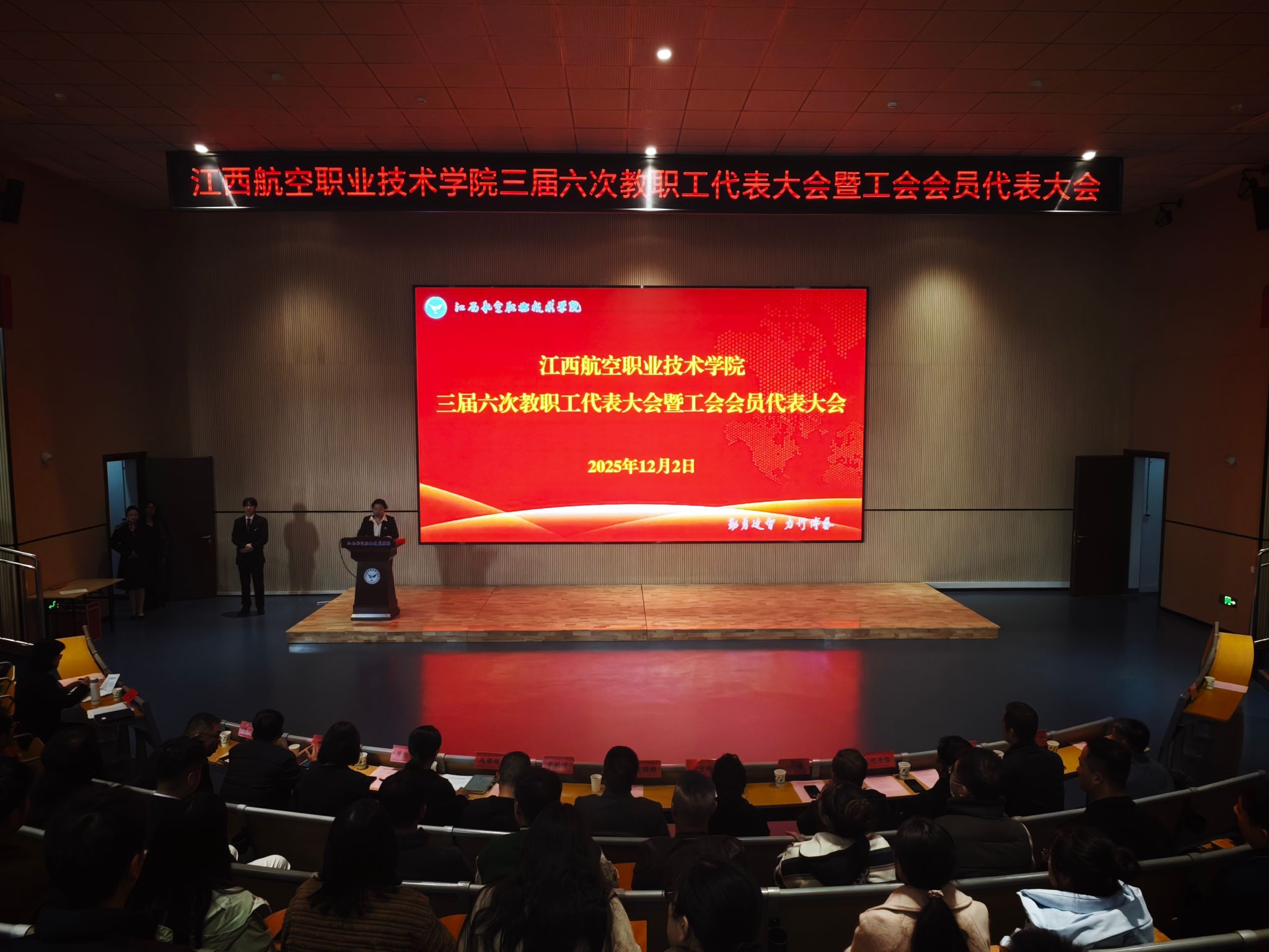 12月2日下午,江西航空职业技术学院第三届六次教职工代表大会暨工会会员代表大会在3号公教楼报告厅顺利召开。学校理事长左国雄、党委书记(督导专员)潘莹璐、监事长兼纪委书记章航海,常务副校长周珊珊等领导出席大会。大会由工会主席李宏主持。