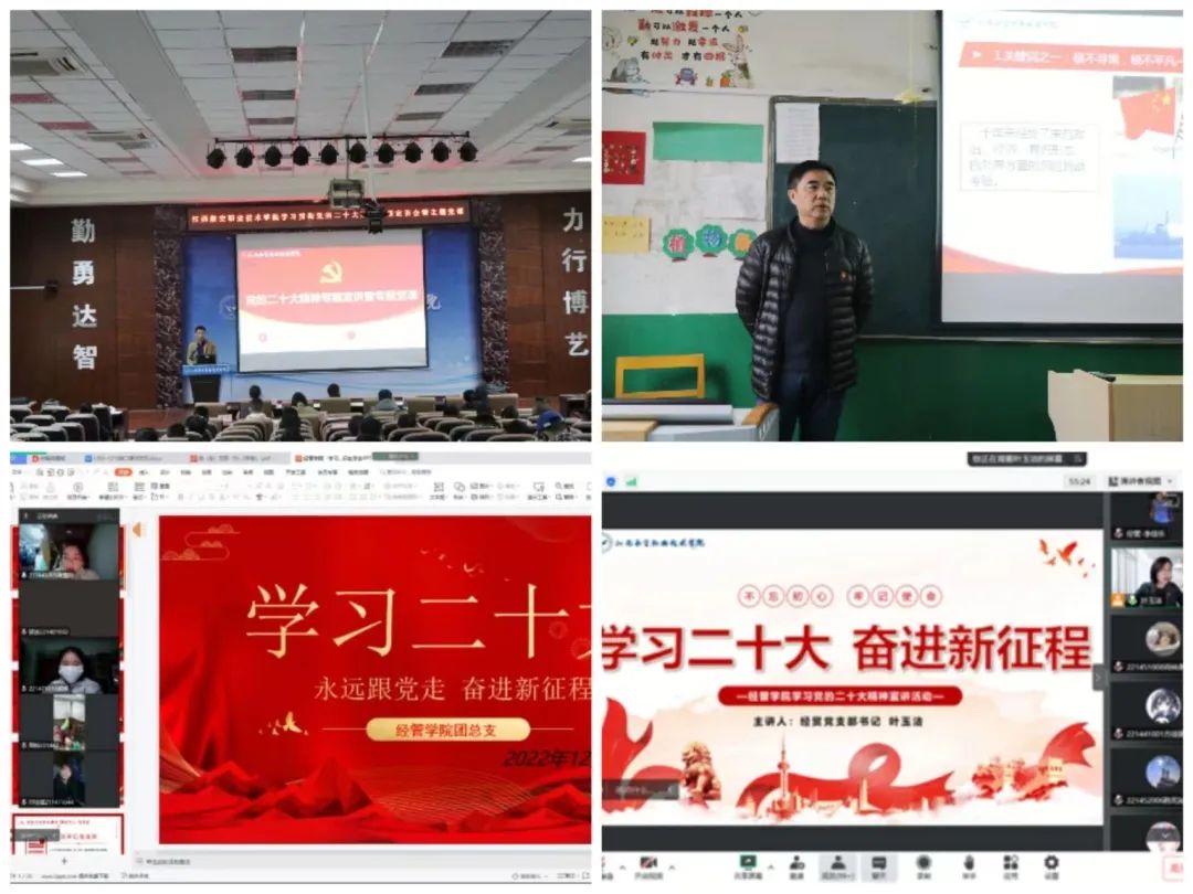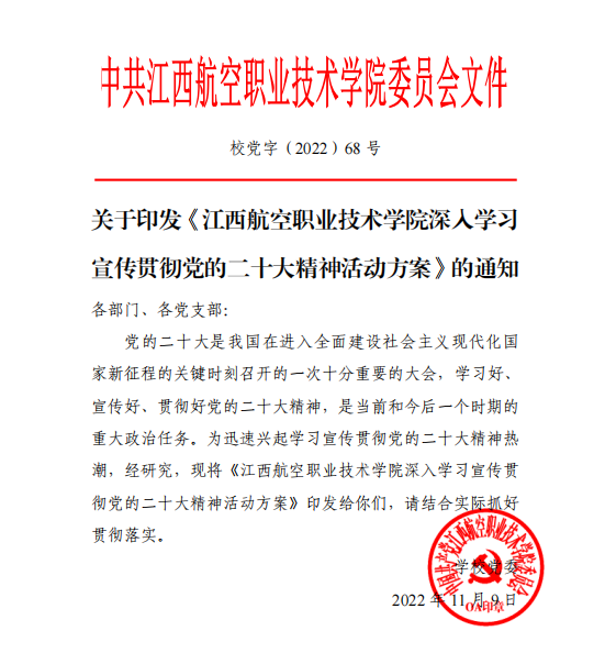 立足新征程,肩负新使命。党的二十大胜利召开后,江西航空职业技术学院紧紧抓住学习宣传贯彻党的二十大精神“黄金期”,引导广大师生通过专家授课、专题会议、主题活动等多种形式,将思想和行动统一到党的二十大精神上来,确保第一时间传达学习、第一效率抓好贯彻、第一责任推动落地,迅速掀起学习宣传贯彻党的二十大精神热潮。