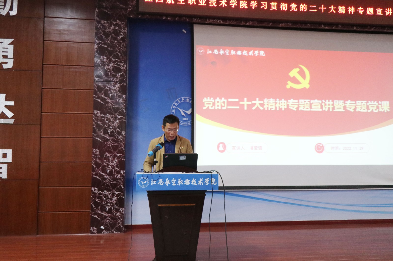 为深入学习宣传贯彻党的二十大精神,进一步统一思想,提高认识,发挥作用,凝聚力量,我校于11月29日下午在五楼阶梯教室开展专题宣讲会。本次宣讲会由校党委书记、督导专员潘莹璐作宣讲报告,校党委副书记、副校长杨建辉主持,全体党员、教职工代表和学生代表参加本次宣讲会。