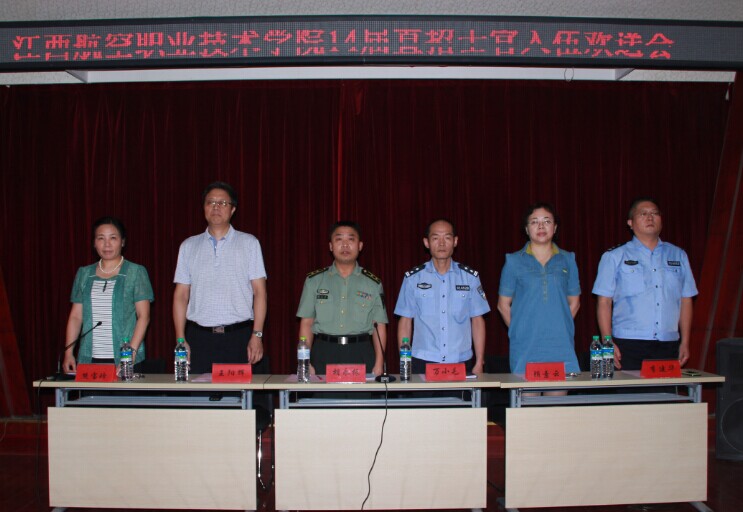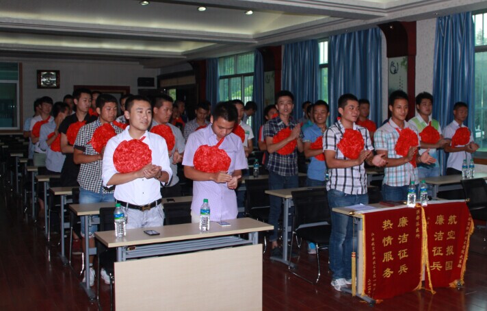2014年8月7日下午4时,在江航学院科苑楼召开11级直招士官欢送会,参加欢送会的有区人武部胡勇振副部长、洪都公安分局万小毛副局长、洪都派出所李建华所长、王阳辉院长、顾素云副院长、熊宝珍副院长及学院相关部门领导,今年我院直招士官45名,其中空军37人,海军7人,二炮1人,欢送会由熊副院长主持并致辞。首先由学生代表发言,学生代表为感谢学院的培养及洪都派出所的关爱分别赠送了锦旗,区人武装部胡勇振副部长在讲话中分析了国内外形势,在应届毕业生中直招士官是军队现代化建设的需要,对即将步入军营的学子们寄予厚望,勉励同学们要立足军营。针对部队士官特点洪都公安分局万副局长谈了今年政审工作的严肃性,殷切希望同学们要珍惜荣誉,牢记使命。预祝学子们在部队工作、学习、生活愉快。最后王院长做了热情洋溢的讲话,提出三点希望: