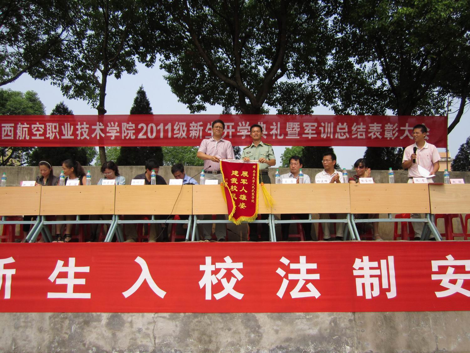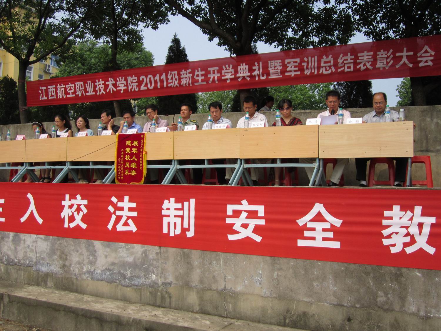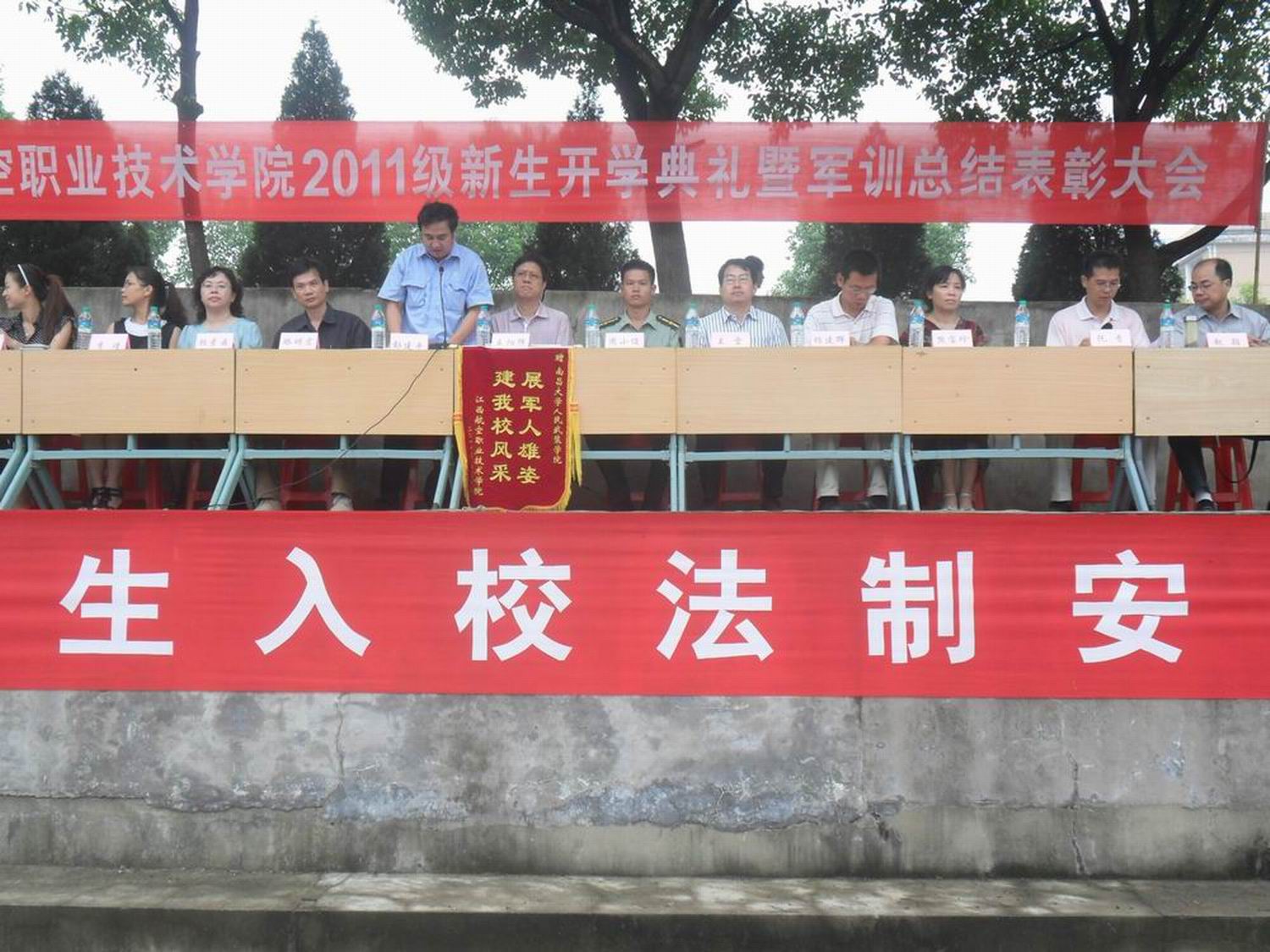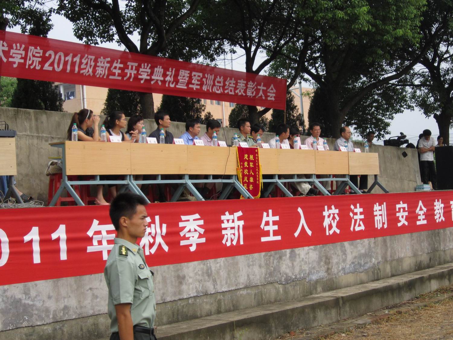 2011年9月7日上午9点,820多名11级新生身着戎装,排着整齐的队伍站立在学院操场上,接受院领导的检阅,伴随着庄严的国歌声,我院2011级新生开学典礼暨军训总结表彰大会在学院操场拉开帷幕。大会由学工处阮青处长主持。出席此次军训总结大会的有我院王阳辉院长、院党委书记彭建平、周小俊中队长、副院长杨建辉、副院长滕明宏、副院长熊宝珍等学院领导、老师代表、承训部队领导。会上党委彭建平书记发表了热情洋溢的讲话。并由王阳辉院长代表学院向承训部队赠送了锦旗。大会开始前,王阳辉院长检阅了受训学生,在王阳辉院长走到排列整齐的受阅队伍前向同学们问好致意时,整齐响亮的“首长好”、“为院争光”响彻全场。在分列式中,各连组成的方队迈着整齐的步伐通过了主席台,接受领导的致意。表演方队的表演更是获得了领导们的阵阵掌声。此次军训总结大会上,周小俊中队长进行了军训工作总结,他认为,本次军训之所以能够圆满成功,主要得益于领导们的重视和关心,前期的充分准备、教官和同学们的努力以及灵活多样的训练方法。在开学典礼上,教师代表赵颖副教授发言,对新生表示热烈的欢迎和衷心的祝贺,并对他们提出更高的期望,要有勇于实践,不断创新的开拓精神。会上共评选出优秀连队3个、优秀教官3名、军训优秀学员44名,并分别给予了表彰。至此,11级军训工作画上了圆满的句号。
