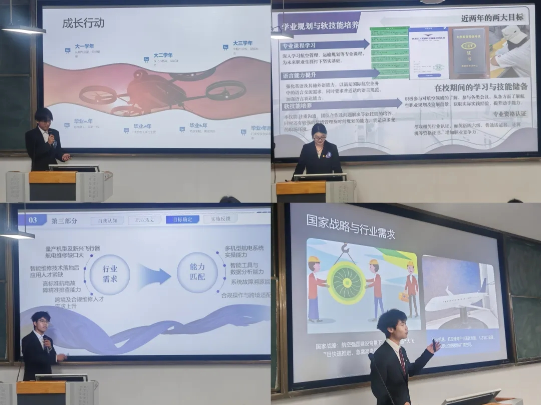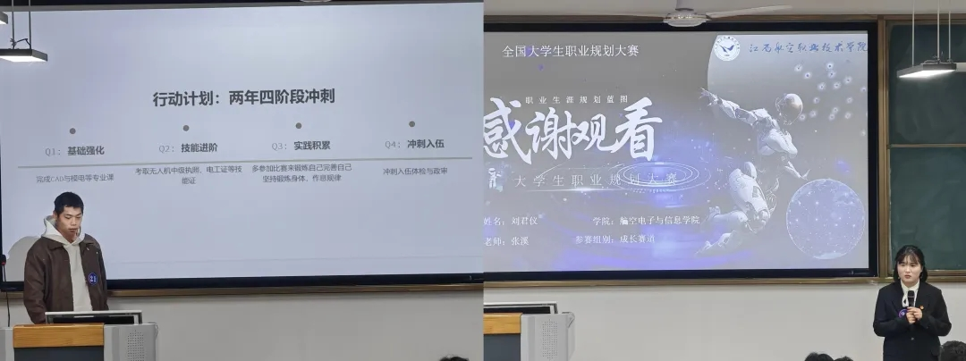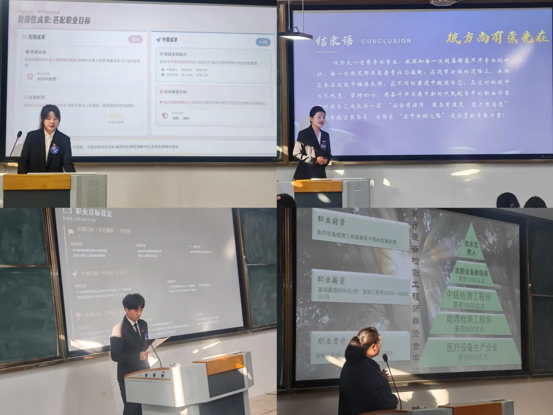 与此同时,就业赛道的角逐在公教楼1号楼109教室火热进行,比赛时间为当日14:00至17:00。校团委书记刘斯涵、校团委副书记刘飞、无人装备学院副院长刘晔冰担任该赛道评委,三位评委从职业规划的科学性、可行性、创新性等维度,对选手表现展开全面考评。