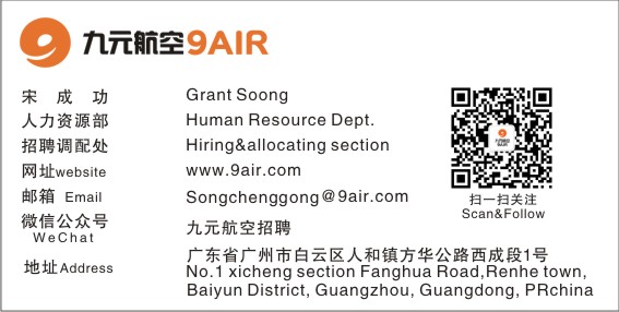 乘务/安全员招聘日程,统一在“九元航空招聘”微信公众号发布,请及时关注以免错过面试时间。
