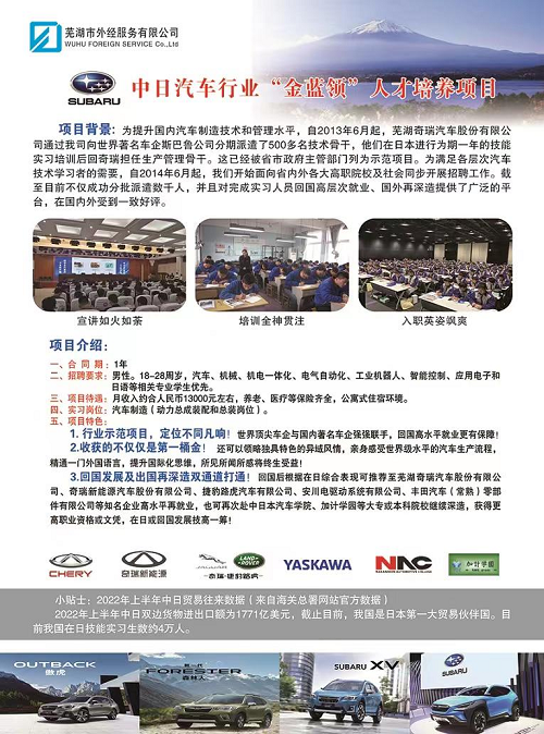 本次初试时间暂定,初试通过后,根据要求做出国体检,家属访问,之后参加斯巴鲁日方复试,录取后可能会安排在国内企业顶岗实训2- 3个月左右(实习工资每月约 3500-5500 元),之后参加出国前日语培训三个月。