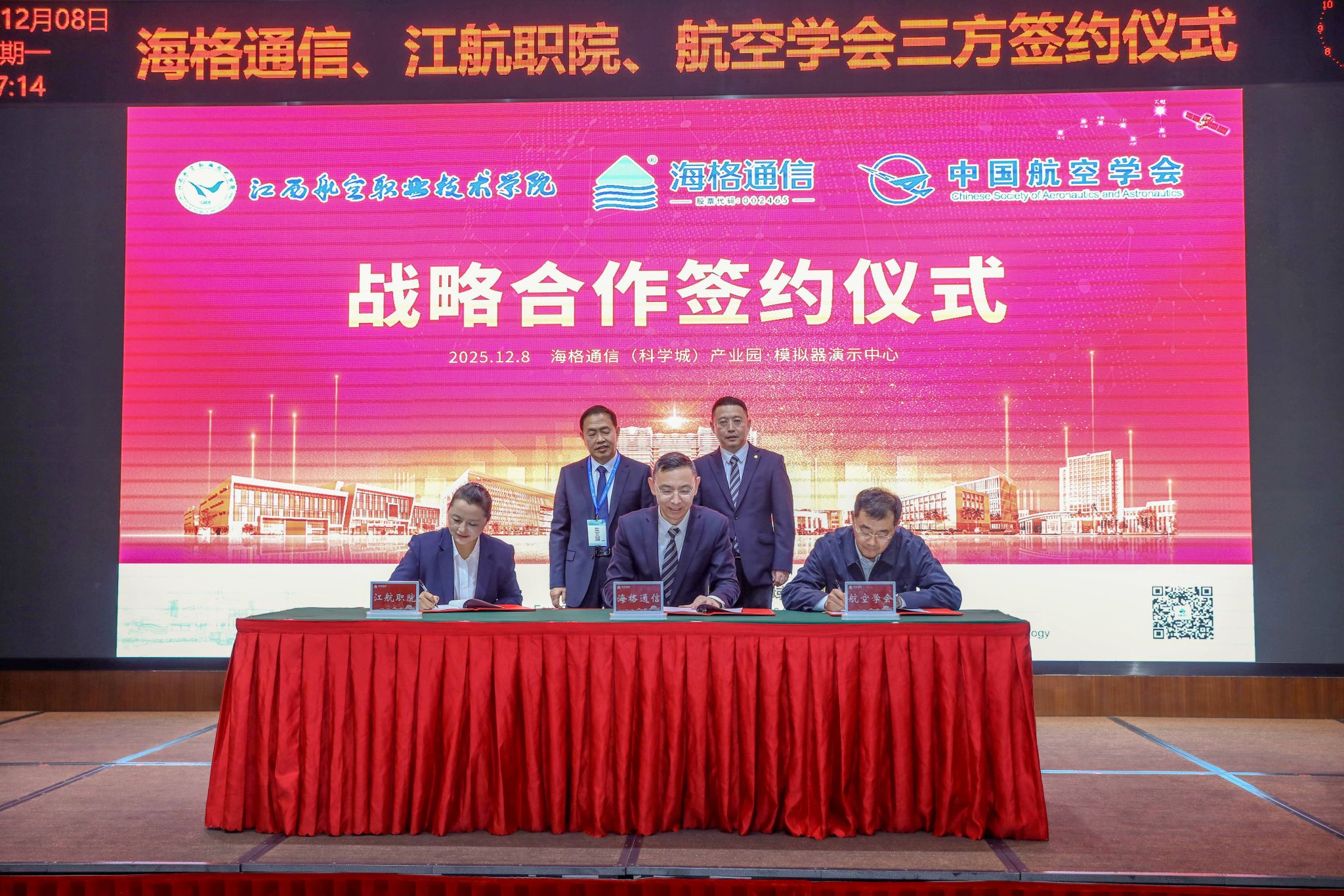 当日下午,周延校长与中国航空学会监事长李春宏、中科院闫楚良院士、中国航空学会国防教育工作办公室主任李鸣等一行二十余人赴广州海格通信集团股份有限公司,实地参观研发大楼与“科技+文化”展示中心,详细了解海格通信在无线通信、北斗导航、航空航天、无人机防控等领域的技术研发实力与产业发展布局,并与海格通信、中国航空学会共同签署三方战略合作协议。